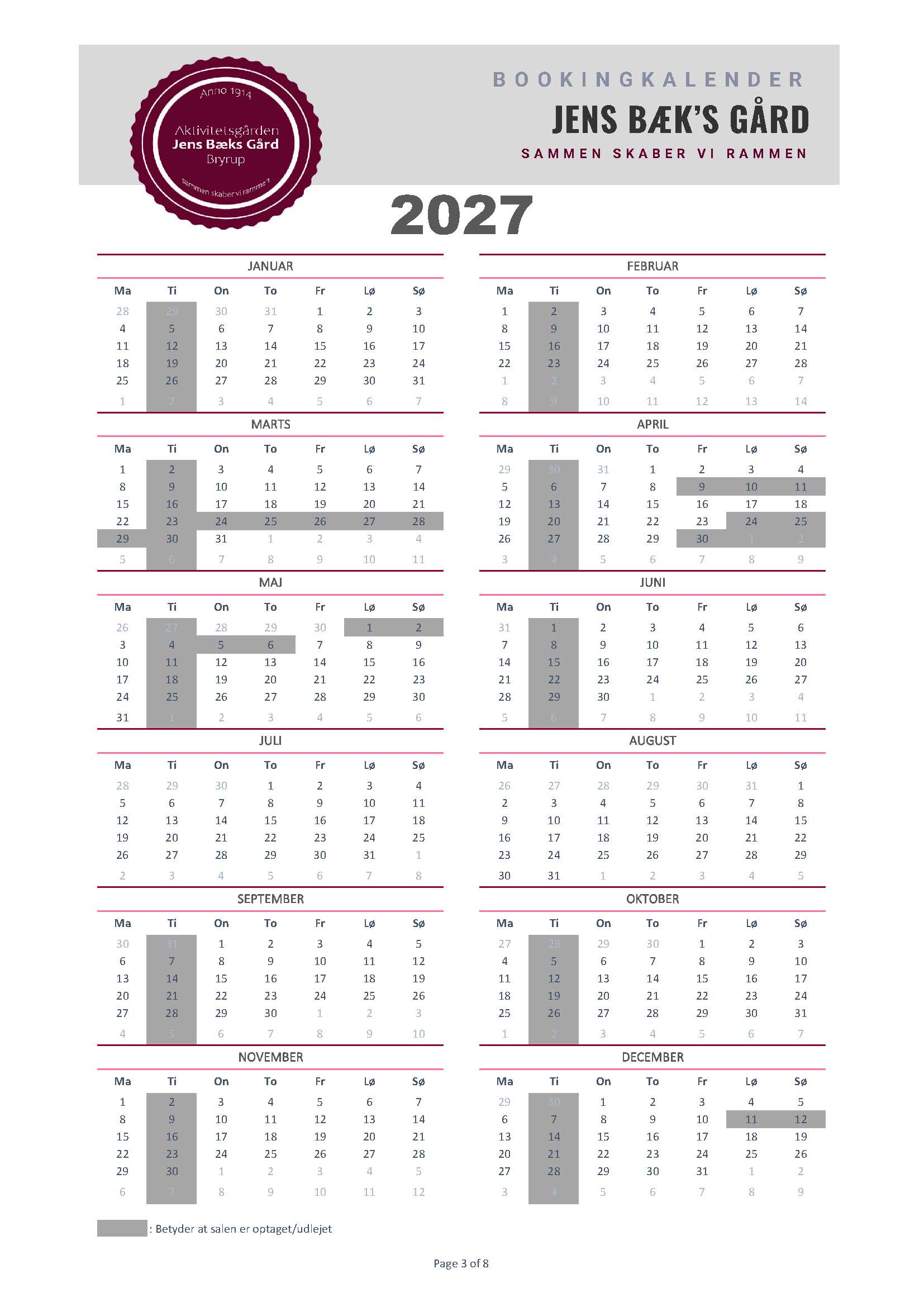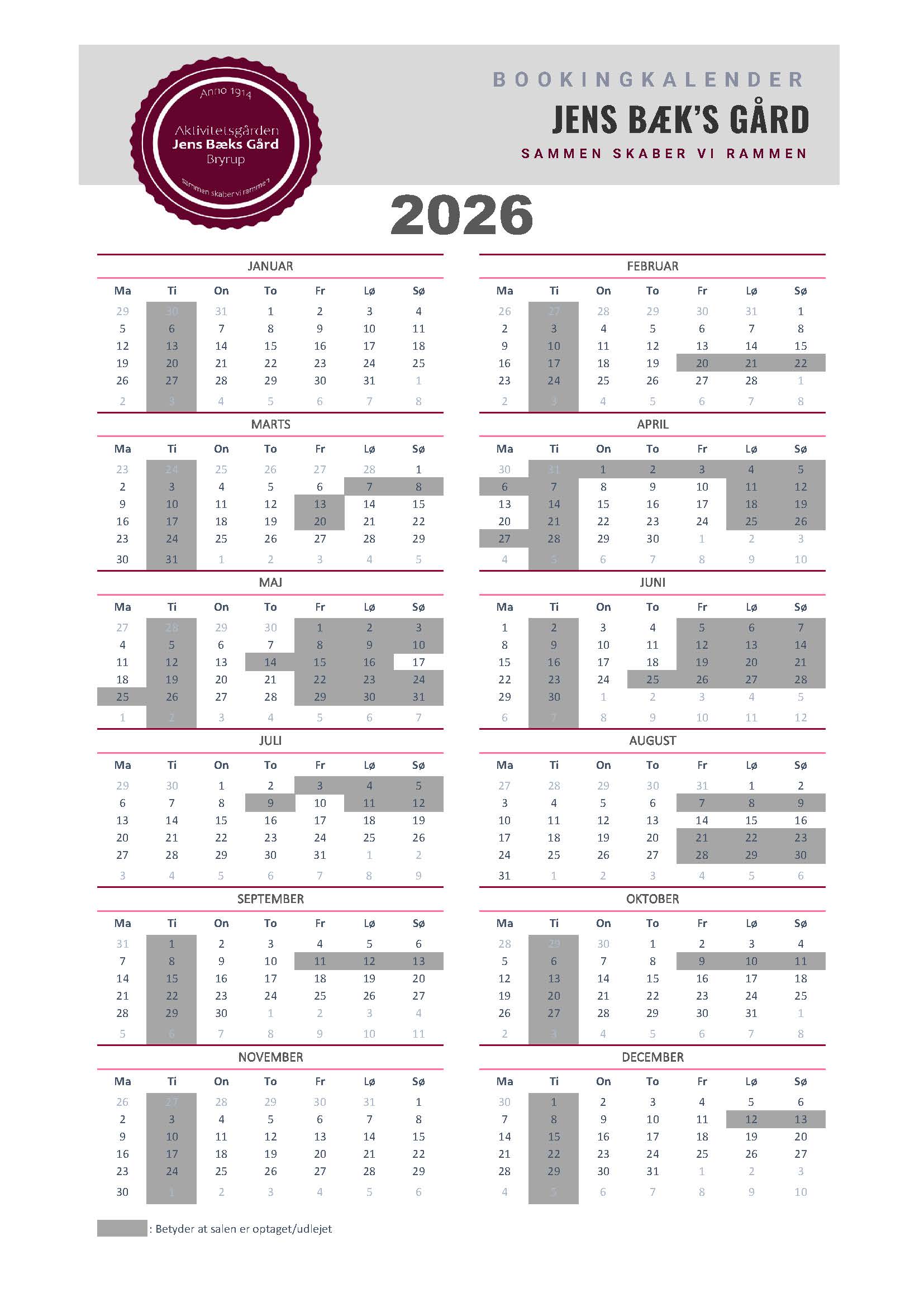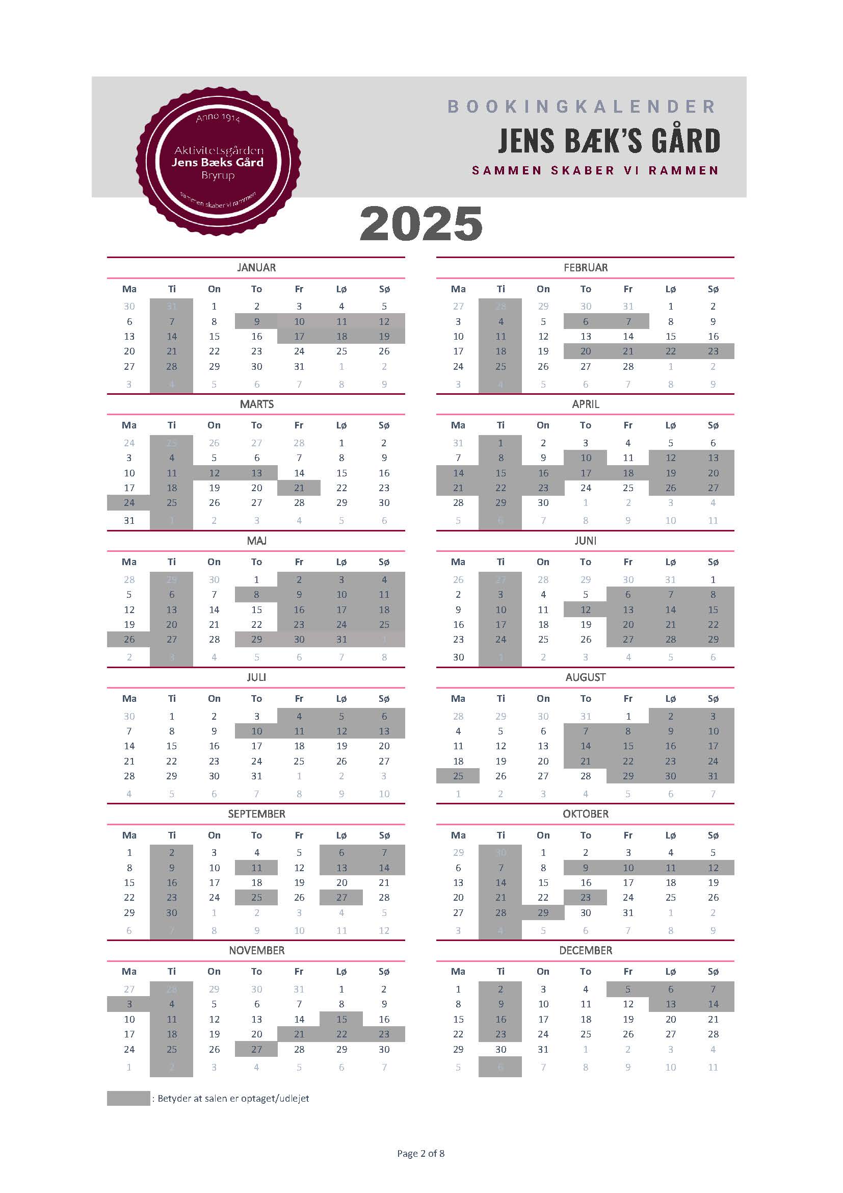 Silkeborg Kommunes formålet med gården er at skabe gode rammer om kulturelle og fritidsmæssige aktiviteter for borgere, dvs. at gården på mange hverdage er booket til disse formål af bl.a. Bryrup Seniorklub, Busy Boots og dagplejen. Derfor vil disse dage fremgå som optaget, men da JBG samtidig fungerer som Bryrups forsamlingshus har du altid mulighed for at kontakte booking@jbgbryrup.dk og forhører dig omkring mulighederne, hvis datoen du ønsker er optaget.