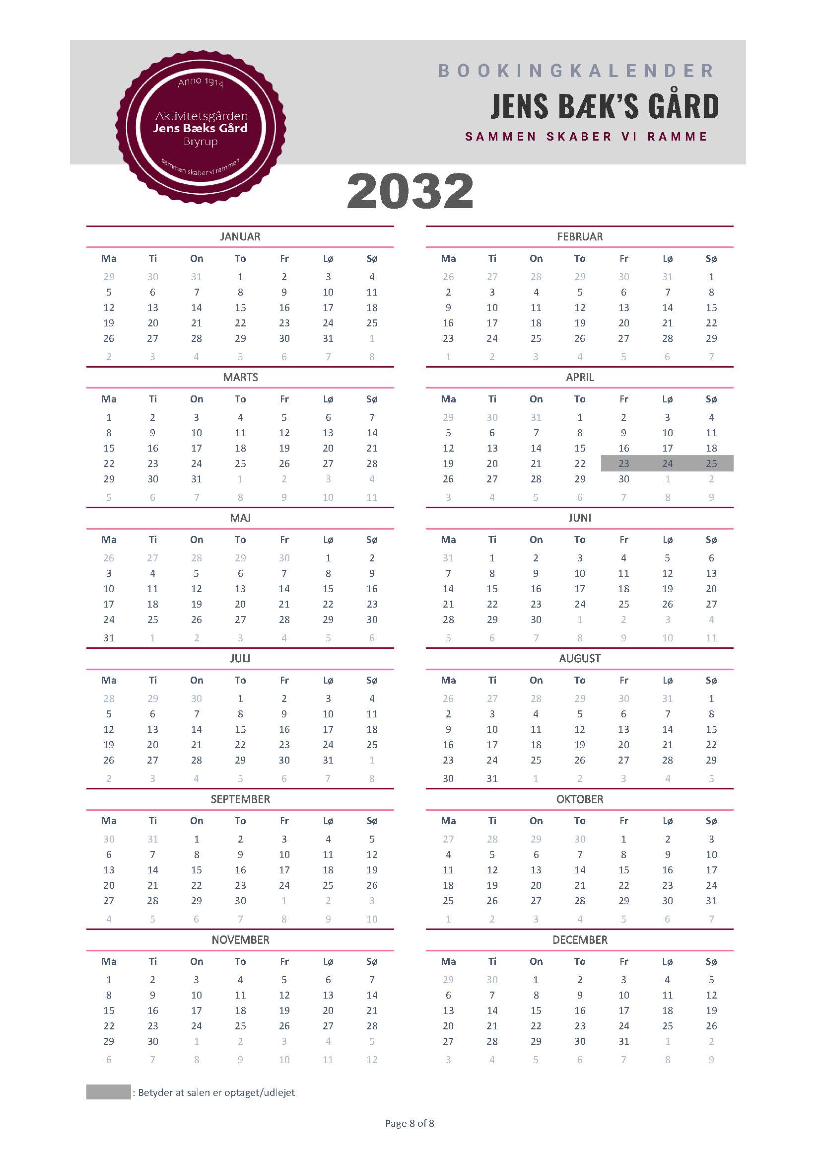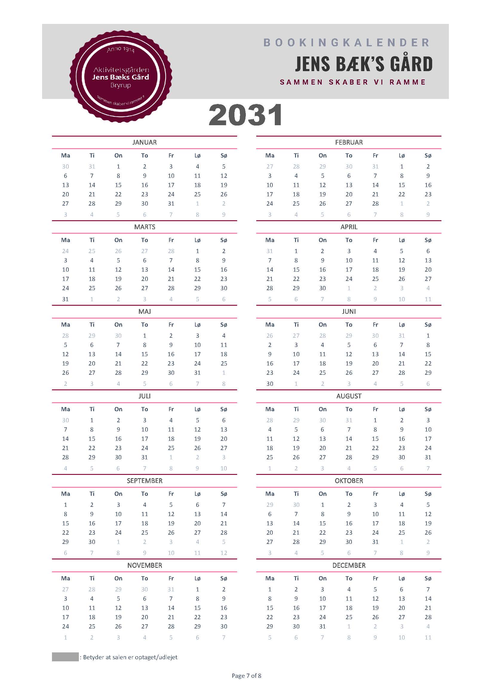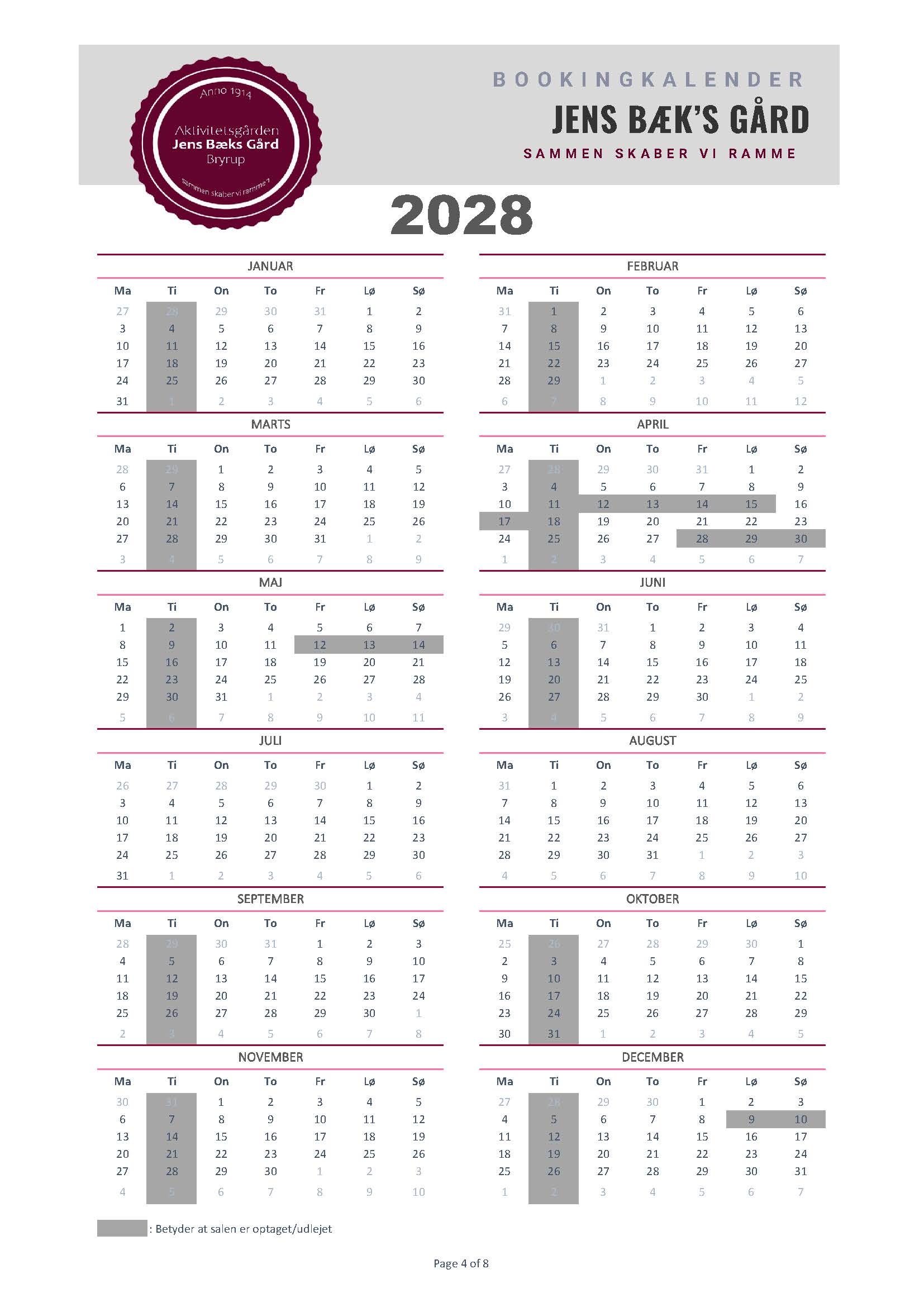 Silkeborg Kommunes formålet med gården er at skabe gode rammer om kulturelle og fritidsmæssige aktiviteter for borgere, dvs. at gården på mange hverdage er booket til disse formål af bl.a. Bryrup Seniorklub, Busy Boots og dagplejen. Derfor vil disse dage fremgå som optaget, men da JBG samtidig fungerer som Bryrups forsamlingshus har du altid mulighed for at kontakte booking@jbgbryrup.dk og forhører dig omkring mulighederne, hvis datoen du ønsker er optaget.
